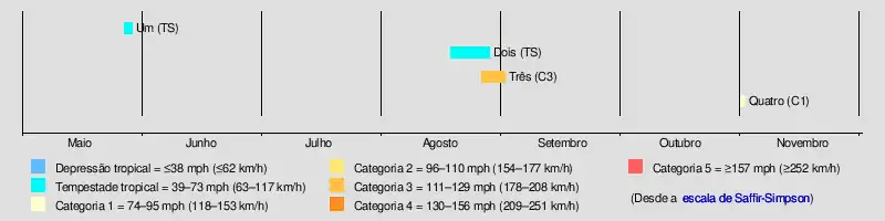 Dos quatro ciclones tropicais da temporada, dois atingiram o status de furacão. Um desses dois se fortaleceu em um grande furacão, que são categoria 3 ou superior na escala de ventos de furacões Saffir-Simpson dos dias modernos. O ciclone mais forte da temporada, o furacão Três, atingiu o pico na força de categoria 3, com ventos máximos sustentados de 190 km/h (120 mph). O mar agitado produzido por esta tempestade afundou um navio nas proximidades das Pequenas Antilhas, afogando 10 pessoas. O último ciclone tropical foi observado pela primeira vez no sudoeste do Mar do Caribe em 31 de outubro. Atingiu o pico de intensidade como furacão forte de categoria 1, dirigiu-se para o oeste e atingiu a Nicarágua, antes de ser observado pela última vez na América Central em 1 de novembro. A tempestade produziu apenas danos menores na Nicarágua. Coletivamente, os ciclones tropicais desta temporada resultaram em pelo menos US$ 1 milhões em danos e 14 fatalidades confirmadas.