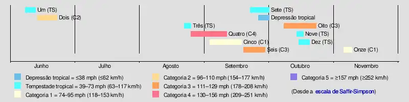 - ↑ Dados das mortes causadas por furacões Cinco e Oito não foram considerados pelos dados do Centro Nacional de Furacões; mesmo assim, o total de mortos, 381, maintem a posição da décima-primeira temporada mais mortal.[1]