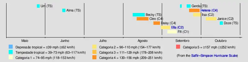 Em maio, uma depressão subtropical formou-se no Caribe e trouxe chuvas fortes perto de Miami, Flórida. A primeira tempestade nomeada da temporada foi Alma, que matou três pessoas e causou enchentes no Texas. O furacão Daisy em agosto foi um grande furacão que acompanhou a costa leste dos Estados Unidos, embora devido ao seu pequeno tamanho não tenha causado muitos danos. O furacão Ella afetou grande parte do Norte do Caribe e do Texas, mais significativamente a República Dominicana, onde 30 pessoas morreram. Ella também matou seis pessoas em Cuba, onde fez "landfall" como um grande furacão. Algumas semanas depois, a tempestade Tropical Gerda também atingiu a República Dominicana e matou três pessoas. A tempestade mais cara da temporada foi Helene, que causou us $11,2 milhões em danos (1958 USD), principalmente na Carolina do Norte. Apesar de ter passado a menos de 16 km do Estado, seus efeitos foram limitados à costa, e o furacão matou uma pessoa. A última tempestade da temporada, Janice, matou oito pessoas na Jamaica quando seu precursor fez cair 20 in (510 mm) de chuva, e uma pessoa foi morta nas Bahamas.