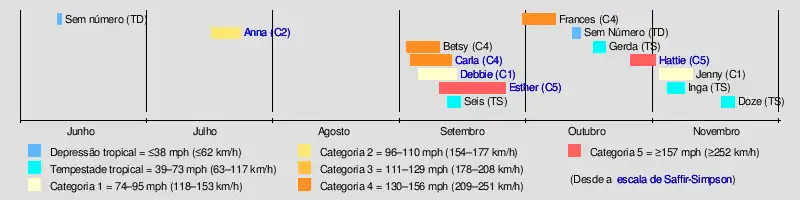 A ciclogênese tropical começou com o furacão Anna, que se desenvolveu em 17 de julho. Depois que Anna se dissipou em 24 de julho, não havia outros sistemas em julho ou no mês de agosto. A bacia do Atlântico permaneceu dormente até o furacão Betsy se desenvolver em 2 de setembro Durante os próximos quatro dias, dois outros ciclones tropicais se formaram - Carla e Debbie. Em 11 de setembro, as três tempestades - Betsy, Carla e Debbie - existiram simultaneamente como furacões,[3] a maioria em um único dia desde 1893 e até 1998.[6] Esther, que se desenvolveu em 10 de setembro, não atingiu o status de furacão até 12 de setembro Mais tarde naquele dia, uma tempestade tropical sem nome formou-se nas Bahamas e atravessou a costa leste dos Estados Unidos durante seu breve período.[3][7]