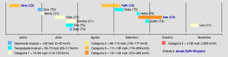 A temporada iniciou-se com a formação do intenso furacão Alma, que se formou sobre a Nicarágua e seguiu para norte, atingindo Cuba e o sudeste dos Estados Unidos, causando 210 mihões de dólares em danos e 90 fatalidades. Na terceira semana de agosto, o furacão Faith formou-se ao sul de Cabo Verde e cruzou o Atlântico seguindo para oeste. Ao passar a leste das Bahamas, Faith recurvou e cruzou novamente o Atlântico, deixando de ser um ciclone tropical ao norte da Escócia em 7 de setembro. Percorrendo mais de 12.000 km, Faith tornou-se o furacão de maior trajetória percorrida no Atlântico até os dias de hoje. Ainda em setembro, a tempestade tropical Hallie atingiu a costa do golfo do México, causando apenas danos mínimos. O furacão Inez foi o mais intenso e devastador furacão da temporada, afetando praticamente todo o Caribe, a Flórida e o México, causando mais de 1.000 fatalidades e 200 milhões de dólares em prejuízos.