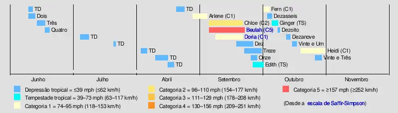 | Beulah | 5 de setembro – 22 | Furacão categoria 5 | 260 (160) | 923 | Grandes Antilhas, Península de Iucatã, Noroeste do México, Sul do Texas | $234.6 milhões | 59 | |||