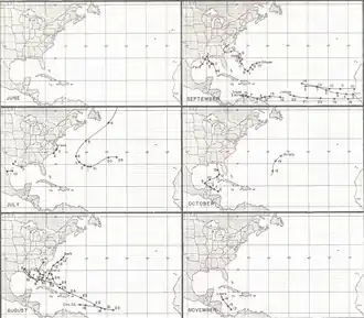 | Vinte e dois | 6 de outubro – 14 de outubro | Depressão tropical | 30 mph (45 km/h) | Península de Yucatán, Flórida | Nenhum | Nenhum | Nenhum | |