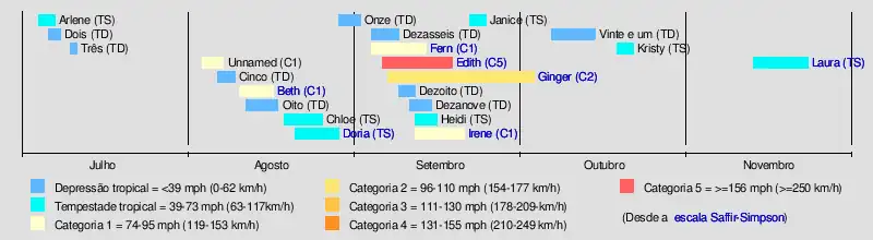 | Edith | 5 de setembro – setembro 18 | Furacão Categoria 5 | 160 mph (260 km/h) | 943 hPa (27,8 inHg) | Pequenas Antilhas, northern Venezuela, norte México, Sudoeste dos Estados Unidos | $25 400 000 | 37 | [7][9] |
