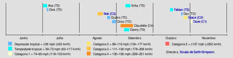| Danny | 7 de setembro – 11 | Tempestade tropical | 85 (50) | 998 | none | Nenhum | Nenhum | |||