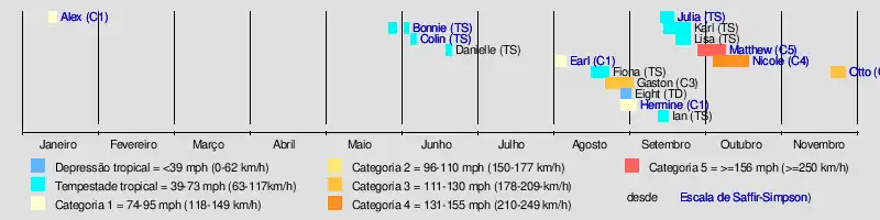 O Earl matou 67 vítimas em Belize e México, Fiona nunca ameaçou terra, enquanto a depressão tropical Oito causou um impacto mínimo. Gastón converteu-se no primeiro furacão da temporada ao este das Bermudas o 28 de agosto. Hermine chegou chuvas torrenciais no Caraíbas, e converteu-se no primeiro furacão para formar no Golfo do México desde Furacão Ingrid em 2013. Em 2 de setembro, Hermine converteu-se no primeiro furacão que golpeia Flórida desde o Furacão Wilma em outubro de 2005.