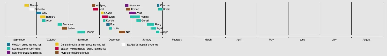 Todas as tempestades nomeadas pelas organizações meteorológicas europeias nas respetivas áreas de previsão, bem como os furacões do Atlântico que se transformaram em tempestades de vento europeias e mantiveram o nome atribuído pelo Centro Nacional de Furacões: