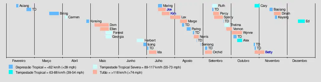| Ellen | 7–22 de maio | Tufão | 195 km/h (120 mph) | 930 hPa (27.46 inHg) | Ilhas Marianas | Nenhum | Nenhum | |