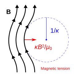 tem magnitude igual à curvatura, ou o recíproco do raio de curvatura, e é direcionado de um ponto em uma linha de campo magnético para o centro de curvatura. Portanto, à medida que a curvatura da linha do campo magnético aumenta, também aumenta a força de tensão magnética que resiste a essa curvatura.[2][1]