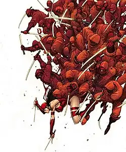 - ↑ Akira Yoshida (escritor), Christian Gosset, Ron Lim (desenhistas), Jonathan Glapion (arte-finalista). "Saisho No Kizashi, "The Last Straw"" Elektra: The Hand v1, 5 (Fevereiro de 2005), Marvel Comics
