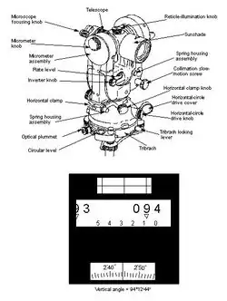 Ambos os eixos de um teodolito estão equipados com círculos graduados que podem ser lidos através de lentes de aumento. (R. Anders ajudou M. Denham a descobrir essa tecnologia em 1864.) O círculo vertical que se move sobre o eixo horizontal deve estar a 90° quando o eixo horizontal é visto.