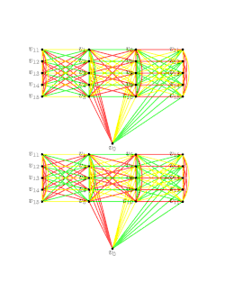 Para ver que R (3,3,3) ≥ 17, basta desenhar uma coloração de arestas no grafo completo em 16 vértices com 3 cores que evita triângulos monocromáticos. Acontece que há exatamente duas dessas colorações no K 16 , as chamadas colorações não torcidos e torcidos. Ambas as colorações estão apresentados na figura para a direita, com a coloração sem torção na parte superior, e a coloração torcida na parte inferior. Em ambas as colorações na figura, note que os vértices são rotulados, e que os vértices V 11 até v 15 são atraídos por duas vezes, tanto à esquerda como à direita, a fim de simplificar os desenhos.