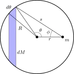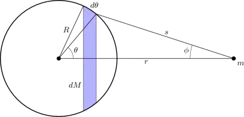 A força exercida no ponto "m" pode ser calculada integrando a força gravitacional de todas as secções.
