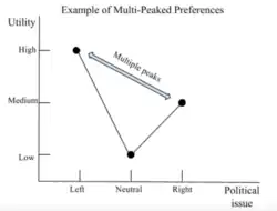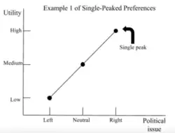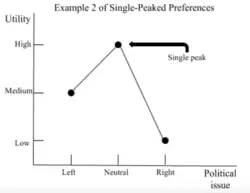 Essa relação pode ser desenhada como uma curva de preferência, e se ela tiver um único pico — o ponto onde a utilidade é máxima — dizemos que o eleitor tem uma preferência de escolha única (single-peaked preference), que é essencial para que o teorema do eleitor mediano funcione.