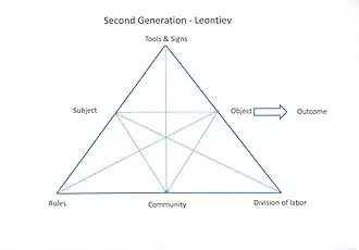 Embora Vygotsky formulasse a atividade humana prática como a categoria explicativa geral da psicologia humana, ele não esclareceu totalmente sua natureza precisa. A segunda geração vai além do modelo individual de Vygotsky para o modelo coletivo de[67] Na[45] da atividade de segunda geração, a unidade de análise foi expandida para incluir a atividade motivada coletivamente em direção a um objeto, abrindo espaço para a compreensão de como a ação coletiva por grupos sociais medeia a atividade.[68] Daí a inclusão de comunidade, regras, divisão de trabalho e a importância de analisar suas interações entre si.[50] As regras podem ser explícitas ou implícitas. A divisão do trabalho refere-se à organização explícita e implícita da comunidade envolvida na atividade. Engeström[45] articulou a distinção mais clara entre a psicologia vygotskiana clássica, que enfatiza a maneira como os sistemas semióticos e culturais mediam a ação humana, e o CHAT de segunda geração de Leontiev, que se concentra nos efeitos mediacionais da organização sistêmica da atividade humana.