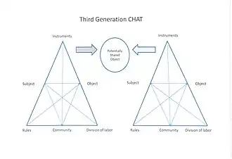 Após o trabalho fundamental de Vygotsky sobre as funções psicológicas superiores do indivíduo[13] e a extensão de Leontiev desses insights para sistemas de atividade coletiva,[77] questões de diversidade e diálogo entre diferentes tradições ou perspectivas tornaram-se desafios cada vez mais sérios, quando, especialmente no pós-1990, a teoria da atividade 'internacionalizou-se'. O trabalho de Michael Cole e Yrjö Engeström nas décadas de 1970 e 1980 - principalmente em paralelo, mas ocasionalmente em colaboração - levou a teoria da atividade a um público muito mais amplo de acadêmicos na Escandinávia e na América do Norte.[78] Uma vez que as vidas e biografias de todos os participantes e a história da comunidade em geral são levadas em consideração, sistemas de atividades múltiplas precisam ser considerados, postulando, de acordo com Engeström, a necessidade de uma "terceira geração" para " desenvolver ferramentas conceituais para entender diálogo, múltiplas perspectivas e redes de sistemas de atividade em interação ".[79][80][81] Esta tela maior de indivíduos ativos (e pesquisadores) incorporados em práticas organizacionais, políticas e discursivas constitui uma vantagem tangível do CHAT de segunda e terceira geração sobre seu ancestral vygotskyano anterior, que se concentrava na ação mediada em relativo isolamento[82] a teoria da atividade de geração é a aplicação da Activity Systems Analysis (ASA) [48][83] na pesquisa de desenvolvimento, onde os investigadores assumem um papel participativo e intervencionista nas atividades dos participantes e mudam suas experiências.