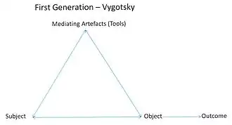 A primeira geração emerge da teoria da mediação cultural de Vygotsky, que foi uma resposta à explicação da consciência do behaviorismo, ou o desenvolvimento da mente humana, reduzindo a "mente" a uma série de componentes ou estruturas atômicas associadas principalmente ao cérebro como processos de "estímulo - resposta" (SR). Vygotsky argumentou que a relação entre um sujeito humano e um objeto nunca é direta, mas deve ser buscada na sociedade e na cultura conforme elas evoluem historicamente, em vez de no cérebro humano ou na mente individual em si.[55] Sua psicologia histórico-cultural tentou explicar as origens sociais da linguagem e do pensamento. Para Vygotsky, a consciência emerge da atividade humana mediada por artefatos (ferramentas) e signos.[13][56]