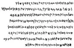 Somos filhos de Canaã, de Sidon, a cidade do rei. O comércio nos trouxe a esta distante praia, uma terra de montanhas. Sacrificamos um jovem aos deuses e deusas exaltados no ano de 19 de Hirão, nosso poderoso rei. Embarcamos em Ezion-Geber, no mar Vermelho, e viajamos com 10 navios. Permanecemos no mar juntos por dois anos, em volta da terra pertencente a Ham (África), mas fomos separados por uma tempestade, nos afastamos de nossos companheiros e, assim, aportamos aqui, 12 homens e 3 mulheres. Numa nova praia que eu, o almirante, controlo. Mas auspiciosamente passam os exaltados deuses e deusas intercederem em nosso favor.