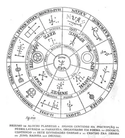 - “700 / Signos / Capricórnio / Pégaso / Peixe / Carneiro / Touro / Dióscros / Caranguejo / Leão / Virgem / Balança / Escorpião / Sagitário / Vênus / Serpentuário / Hidra / Serpente / Cisne / Staurus / Iléias / Hyades / Centauro / Baleia / Orion / Ursa Maior / Ursa Menor / Boeiro / Coroa (boreal) / Hércules / Lira / Eridano / Perseu / Águia / Cão Pequeno / Molossos / Lebre / Delfim / Cérbero / Lobo / Íris/Flecha / Triângulo / Júpiter / Marte / Luz / Sol / Saturno / Mercúrio / Terra / Cocheiro / Taça / Corvo / Navio / Altar /”.[16][17]
