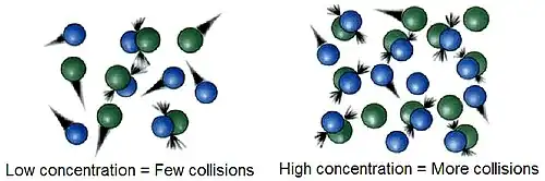 Partículas de diferentes elementos reagem com outras por apresentar energia de ativação com que acertam as outras. Se os elementos reagem com outros, a colisão é chamada de sucesso, mas se a concentração de ao menos um dos elementos é muito baixa, haverá menos partículas para outros elementos reagirem com aqueles e a reação irá ocorrer muito mais lentamente. Com a temperatura aumentando, a energia cinética média e velocidade das moléculas aumenta mas isto é pouco significativo no aumento do número de colisões. A taxa da reação aumenta com a diminuição da temperatura porque uma maior fração das colisões ultrapassa a energia de ativação. A teoria das colisões está intimamente relacionada com a cinética química