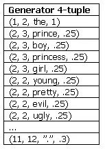 A partir do diagrama de estados finito pode-se inferir os seguintes geradores (à direita) que criam o sinal. Um gerador é uma "4-tupla": estado atual, próximo estado, palavra escrita, e probabilidade da palavra escrita quando há múltiplas escolhas.