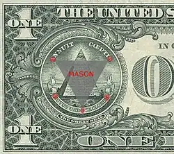 - Que os Estados Unidos foram fundados por maçons e entrelaçaram símbolos maçons na sociedade americana, especialmente em selos nacionais, nas ruas de Washington DC, na arquitetura, bem como no dólar.[32][33][34][35]