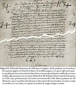 No documento denominado "Fundación de Mayorazgo", onde Colombo supostamente declara a sua naturalidade Genovesa, alguns autores e investigadores levantaram a hipótese de ter sido motivado pelos pleitos que mantiveram seus descendentes com a coroa,[28] e, consequentemente, o declaram como falso ou apócrifo, embora outros investigadores do início do século XX encontraram no Arquivo Geral de Simancas documentos que, segundo eles, mostravam a autenticidade deste documento.[29][30] Manuel Rosa apresentou evidências que, segundo ele, provariam que a "Fundación de Mayorazgo", com data inicial de 1598, sendo depois um 4 escrito por cima do 5 (ver imagem), fora inventada por Baltasar Colombo, litigante no Pleito do Ducado de Verágua, e que o registo no Arquivo Geral de Simancas referir-se-ia à autorização de 1497 para instituir morgado e não a nenhum documento de 1498.[31] Manuel Rosa apresenta evidências que o Documento Assereto fora manipulado pelos Genoveses na sua publicação de 1904 e ainda evidências que provariam que o Memorial de Pagos sobre os Genoveses "Paolo di Negro e Lodovico Centurione" não fazia parte do testamentos de Colombo de 1506 e que fora escrito por outro notário, Pedro Azcoitia, anos após a morte de Colombo e que a autenticidade desse documento fora também contestada durante o Pleito do Ducado de Verágua por haver no documento "de Azcoitia uma falsidade manifesta.".[32]