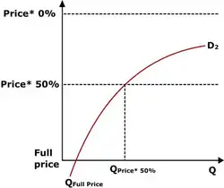 Se introduzirmos uma linha horizontal a tracejado que representa o preço total do bem público, a curva da procura sugere que X procurará uma quantidade relativamente pequena. No entanto, considere um cenário alternativo: em vez de o preço diminuir, a proporção do preço que X tem de pagar diminui. Agora X vê que o preço desce, pelo que a sua procura deste bem aumentará. Agora, considere a curva da procura de outra pessoa, chamemos-lhe Y. Y vê o eixo vertical invertido, com o preço total na base e a percentagem a diminuir à medida que se sobe. Tal como X, Y procurará mais à medida que o seu preço observado desce.