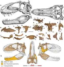 Diagramas de esqueletos mostrando o holótipo dos restos de espécimes de Lythronax (A) e do Teratophoneus (B). C – M mostra ossos selecionados do último