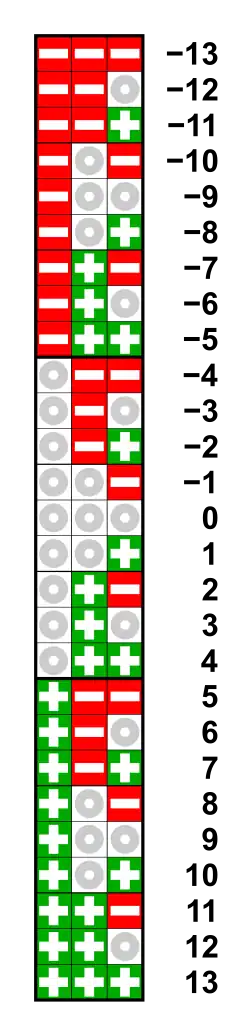 | Decimal | −6 | −5 | −4 | −3 | −2 | −1 | 0 | 1 | 2 | 3 | 4 | 5 | 6 |