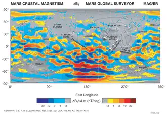 - ↑ Connerney, J. E. P.; Acuña, MH; Ness, NF; Kletetschka, G; Mitchell, DL; Lin, RP; Reme, H (2005). «Tectonic implications of Mars crustal magnetism». Proceedings of the National Academy of Sciences. 102 (42): 14970–14975. PMC 1250232