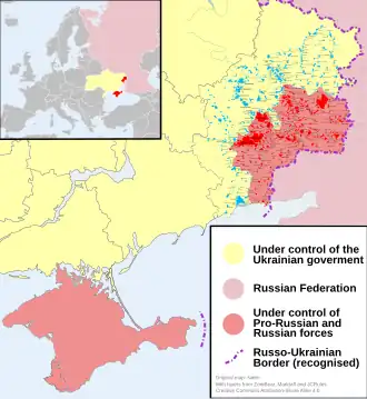 Os "territórios temporariamente ocupados da Ucrânia" (em ucraniano: тимчасово окупована територія України, transl. tymchasovo okupovana terytoriia Ukrainy) foram definidos como tal na lei ucraniana após a intervenção militar russa que resultou na perda do controle ucraniano sobre a península da Crimeia e partes das regiões de Donetsk e Luhansk.[1] A situação da península da Crimeia é mais complexa, pois a Rússia anexou o território em março de 2014 e agora o administra como dois súditos federais - a República da Crimeia e a cidade federal de Sebastopol. A Ucrânia continua a reivindicar a Crimeia como parte integrante de seu território, apoiada pela maioria dos governos estrangeiros e pela Resolução 68/262 da Assembleia Geral das Nações Unidas,[2] embora a Rússia e alguns outros Estados-membros da ONU reconheçam a Crimeia como parte da Federação Russa ou tenham manifestado apoio ao referendo na Crimeia de 2014. Em 2015, o parlamento ucraniano estabeleceu oficialmente 20 de fevereiro de 2014 como a data do "início da ocupação temporária da Crimeia e Sebastopol pela Rússia".[3]