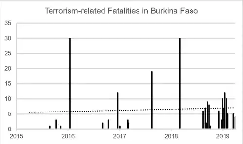 A partir de dezembro de 2018, houve um aumento nas atividades terroristas em Burquina Fasso. Durante um período de dois meses, houve oito ataques terroristas, matando mais de trinta pessoas.