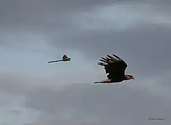 Carcará fugindo de uma tesourinha, espécie muito menor porém brava.