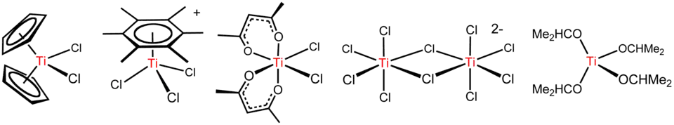 O Tetracloreto de titânio, é um reagente versátil que forma vários outros compostos, incluindo os ilustrados abaixo.