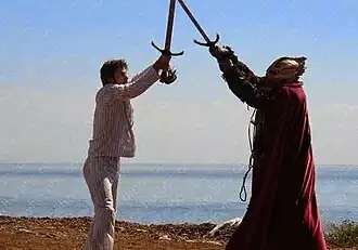 Rose, Mickey e Jackie levam o Doutor para a TARDIS enquanto a nave Sycorax se aproxima de Londres. Antes que Jackie possa retornar com suprimentos adicionais, a máquina também é teletransportada a bordo da nave Sycorax. Rose ganha tempo suficiente para o Doutor finalmente se recuperar após inalar os vapores de um frasco de chá caído. Ele desliga o controle de sangue e então desafia o líder Sycorax para uma luta de espadas pelo destino da Terra. O líder corta a mão do Doutor na batalha, que ele imediatamente faz a crescer novamente, então força o líder Sycorax a se render. O líder tenta atacá-lo pelas costas, mas o Doutor atinge um sensor com uma tangerina que tinha em seu roupão, fazendo com que parte da asa se dobre e derrube o líder para a morte.[5]