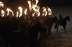![]() Guerreiros Dothraki com suas arakhs em chamas antes do ataque contra os mortos-vivos na batalha em Winterfell | |||