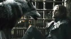 ![]() O lobo gigante Vento Cinzento, confrontando Jaime Lannister. | |||