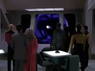 ![]() Os negociadores observando o buraco de minhoca | |||