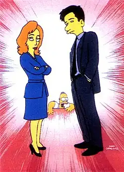 ![]() Os agentes Fox Mulder (à direita) e Dana Scully (à esquerda) vão a Springfield investigar o caso de Homer (ao fundo, centralizado), que alega ter visto um alienígena, na imagem promocional do episódio. | |||||