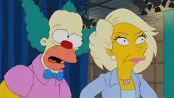 ![]() Krusty (à esquerda) não se sente confortável ao perceber que Annie (à direita, voz de Joan Rivers) começou a interferir em seu programa na televisão a cabo. | |||||