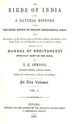 - Jerdon, T. C. 1863 The Birds of India. Volume I 1857 (May 30, 1863)