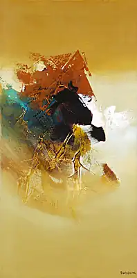 No mesmo ano fez várias exposições individuais, todas no estado de São Paulo, sendo uma em Araçatuba, uma em Lins, uma em Marília e outras duas na cidade de São Paulo.[38] Essa exposição é o desprendimento do artista do movimento figurativo,[39] aliás, essa mostra itinerante foi batizada pelo artista como "A exposição de despedida do figurativismo",[32] que rendeu o equivalente à compra de dois carros na época, mas esse dinheiro não chegou de forma integral para o artista, pois o banco faliu, sendo que o artista afirmou que esse "foi o primeiro, mas não o último golpe que sofri com a economia brasileira".[40] Ivo Zanini descreve a passagem de Fukushima do figurativo para o abstracionismo, segundo ele: "Por vários anos (de 1946 a 1960) movimentou-se pelo figurativismo, quando fundou em São Paulo, no bairro do Paraíso, o Grupo Guanabara, que reunia artistas já em plena convivência com as oscilações da arte moderna" e continua, exemplificando os temas das pinturas: "Mas o abstracionismo, já largamente exercido na Europa e EUA, não tardaria a cooptar Fukushima, como aconteceu com numerosos outros artistas figurativos da época. Portas e janelas, árvores e flores, xícaras e bules, retratos e nus, aos poucos começaram a dar lugar a riscos e traços, à linguagem informal. A busca agora era para as formas e construções que transcendessem a figura e para as cores, plácidas ou ardentes, que pudessem manifestar unicamente harmonia conjuntural". Zanini continua com seu comentário sobre as mudanças do pintor: "E foi concentrando-se na necessidade do desdobramento figurativo-informal, preocupado em pintar com espontaneidade na busca de transmitir sensações e verdade interior, na base do gestualismo, que Tikashi Fukushima pesquisou e enveredou pelo abstracionismo. Tornou-se quase obsessivo na pintura de telas onde se fundem imagens que podem sugerir mares infinitos, ventos cruzando desertos ou montanhas, manhãs outonais, miragens, território virgens, crepúsculos serranos, brisas, sonhos, serenidade celestial, etc. Um mundo onírico, por onde viaja, talvez até como se fosse em outro planeta, em que só o lirismo não pode estar ausente".[41]