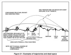 A OTAN define tiro indireto como “Tiro disparado contra um alvo que não pode ser visto pelo mirante”.[1] A implicação é que a "mira" de azimute e/ou elevação é feita usando métodos instrumentais. Conseqüentemente, tiro indireto significa aplicar "dados de disparo" a miras de azimute e elevação e estabelecer essas miras. O tiro indireto pode ser usado quando o alvo estiver visível da posição de tiro. No entanto, é usado principalmente quando o alvo está a um alcance maior e é invisível para o atirador devido ao terreno. O alcance mais longo utiliza uma trajetória mais alta e, em teoria, o alcance máximo é alcançado com um ângulo de elevação de 45 graus.[2][3][4]