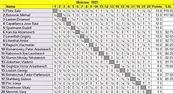 | José Raul Capablanca | 0.5 | 0.5 | 0 | xxx | 0.5 | 1 | 1 | 0.5 | 1 | 0.5 | 1 | 0.5 | 0.5 | 0 | 1 | 0.5 | 0.5 | 0.5 | 1 | 1 | 12 |