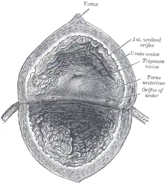 O trígono da bexiga, é uma região encontrada infero-posteriormente nesta víscera. Seus limites são os óstios ureterais (esquerdo e direito) e o óstio interno da uretra (inferiormente). Neste trígono a túnica mucosa é sempre lisa, mesmo quando a bexiga está vazia, porque a túnica mucosa sobre o trígono é firmemente aderida à túnica muscular adjacente.[1]