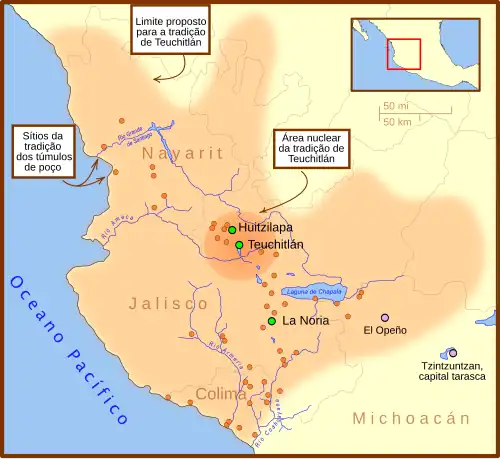 A tradição de Teuchitlán é uma ramificação da mais antiga cultura dos túmulos de poço, mas com uma mudança de centros menores para sítios maiores como Los Guachimontones.[4]