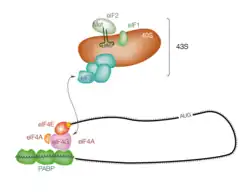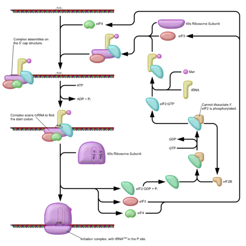 A iniciação da tradução geralmente envolve a interação de certas proteínas-chave, os fatores de iniciação, com uma etiqueta especial ligada à extremidade 5' de uma molécula de mRNA, a cap 5', bem como com o 5' UTR. Essas proteínas ligam a pequena subunidade ribossomal (40S) e manter o mRNA no lugar. eIF3 é associado com a subunidade ribossomal 40S e desempenha um papel em manter a subunidade ribossomal grande (60S) de ligar-se prematuramente. eIF3 também interage com o complexo eIF4F, que consiste em três outros fatores de iniciação: eIF4A, eIF4E e eIF4G. eIF4G é uma proteína de andaime que se associa diretamente tanto com eIF3 como com os outros dois componentes. eIF4E é a proteína de ligação ao cap. Ligação do cap por eIF4E é frequentemente considerada a etapa limitante da taxa de iniciação dependente do cap, e a concentração de eIF4E é um nexo regulatório de controle translacional. Certos vírus clivam uma porção de eIF4G que liga-se eIF4E, evitando assim que a tradução dependente de cap sequestre a maquinaria do hospedeiro em favor das mensagens virais (independentes de cap). eIF4A é uma helicase de RNA dependente de ATP que auxilia o ribossomo resolvendo certas estruturas secundárias formadas ao longo do transcrito de mRNA.[2] A proteína de ligação a poli(A) (PABP, de poly(A)-binding protein) também associa-se com o complexo eIF4F via eIF4G, e liga a cauda poli-A da maioria das moléculas de mRNA eucarióticas. Esta proteína tem sido envolvido em desempenhar um papel na circularização do mRNA durante a tradução.[3][4] Este complexo de pré-iniciação 43S (43S PIC) acompanhado pelos fatores de proteína se move ao longo da cadeia de mRNA em direção a sua extremidade 3', em um processo conhecido como 'varredura', para alcançar o códon de iniciação (tipicamente AUG). Em eucariotas e arquea, o aminoácido codificado pelo códon de iniciação é a metionina. O tRNA iniciador carregado com Met (Met-tRNAiMet) é trazido para o sítio P da pequena subunidade ribossômica por fator de iniciação eucariótico 2 (eIF2). Ele hidrolisa o GTP e sinaliza para a dissociação de vários fatores da pequena subunidade ribossômica, eventualmente levando à associação da grande subunidade (ou a subunidade 60S). O ribossomo completo (80S) então começa o alongamento da tradução.