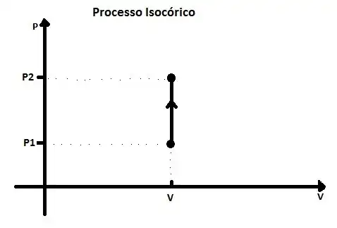 A transformação isovolumétrica pode também ser chamada de transformação isocórica, na qual está relacionado ao comportamento dos gases, onde o volume é constante submetendo variações proporcionais de pressão e temperatura como mostrado abaixo.