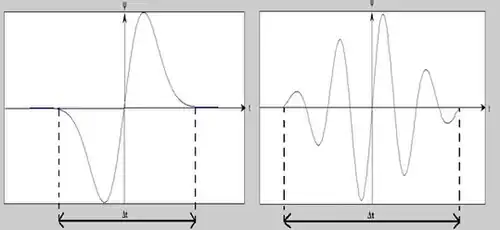 Em outras palavras, a função básica pode ser considerada como uma resposta ao impulso de um sistema com o qual a função foi filtrada. O sinal transformado fornece informações sobre o tempo e a frequência. Portanto, a transformada wavelet contém informações semelhantes à transformação de Fourier de curto prazo (STFT, ou Short-Time-Fourier-Transformation, em inglês), porém com propriedades especiais adicionais das onduletas. Essas propriedades aparecem na resolução temporal em frequências de análise mais altas da função-base. A diferença na resolução de tempo em frequências crescentes para a transformada de Fourier e a transformada wavelet é mostrada abaixo. Observe, entretanto, que a resolução da frequência está diminuindo para frequências crescentes, enquanto a resolução temporal aumenta. Esta consequência do princípio da incerteza de Fourier não é exibida corretamente na Figura.